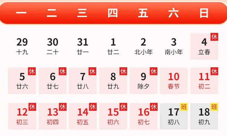 根據(jù)國(guó)家法定節(jié)假日安排,我公司將于2024年春節(jié)期間放假,具體時(shí)間如下: